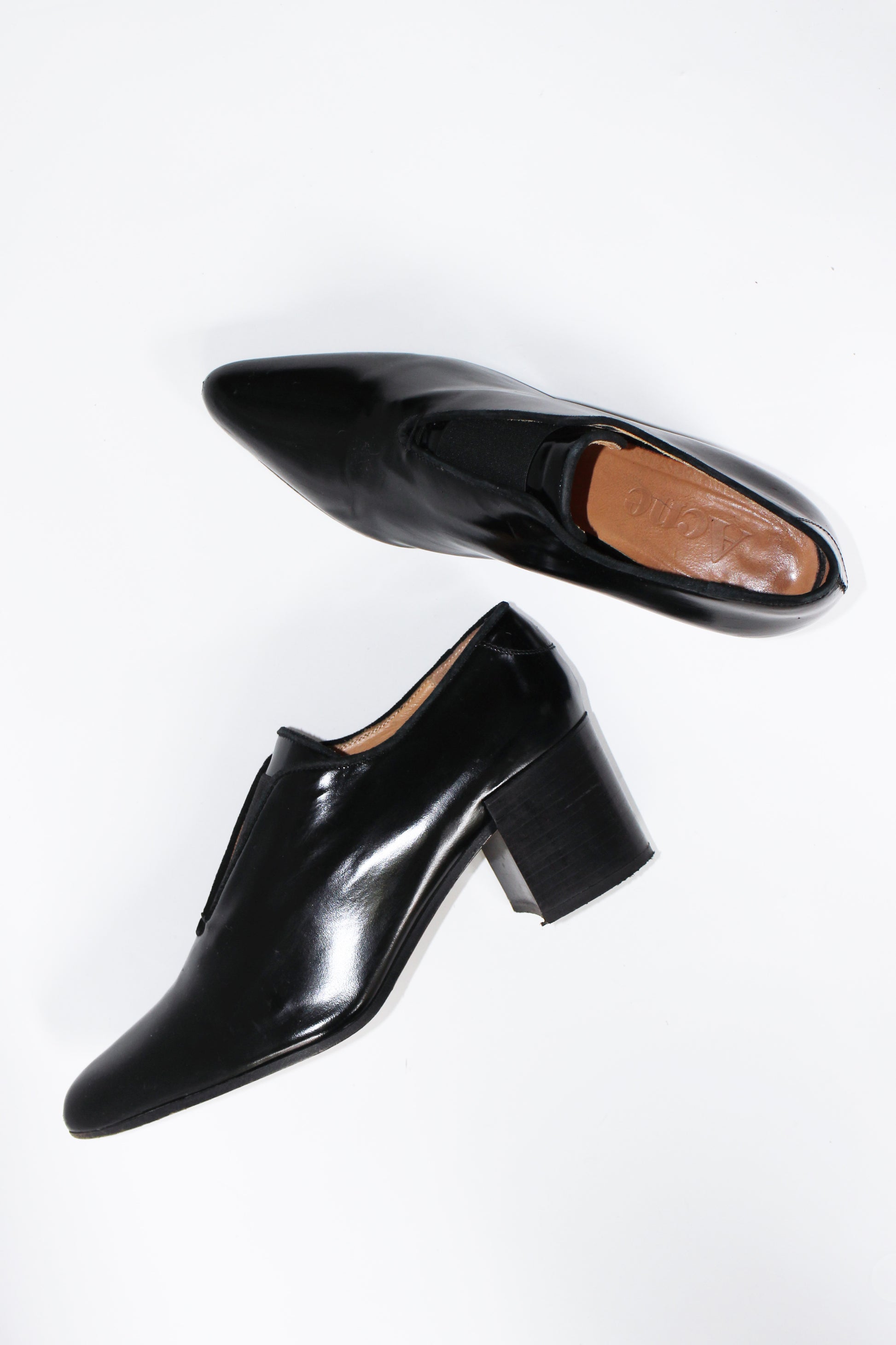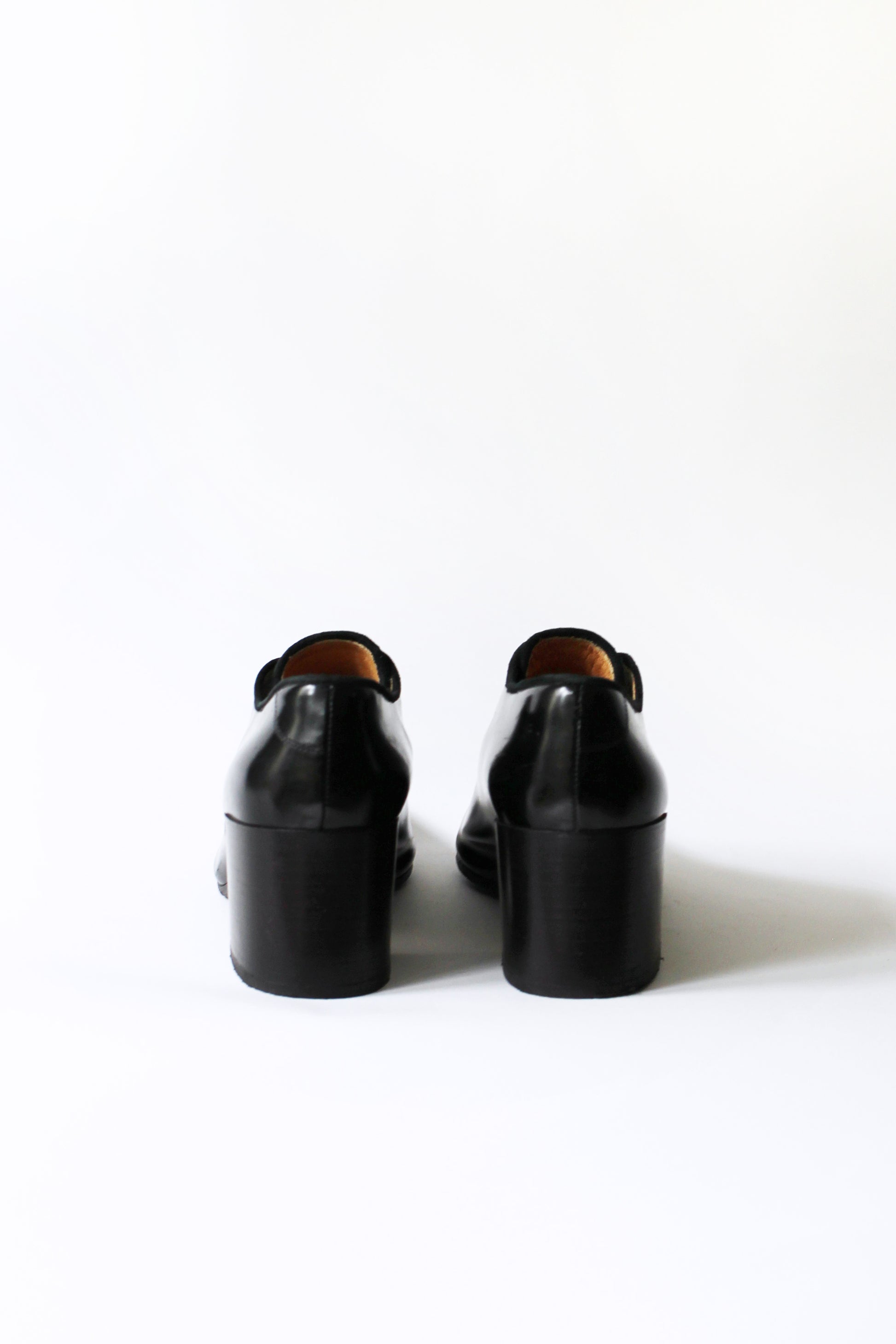 Dark brown patent leather heels.